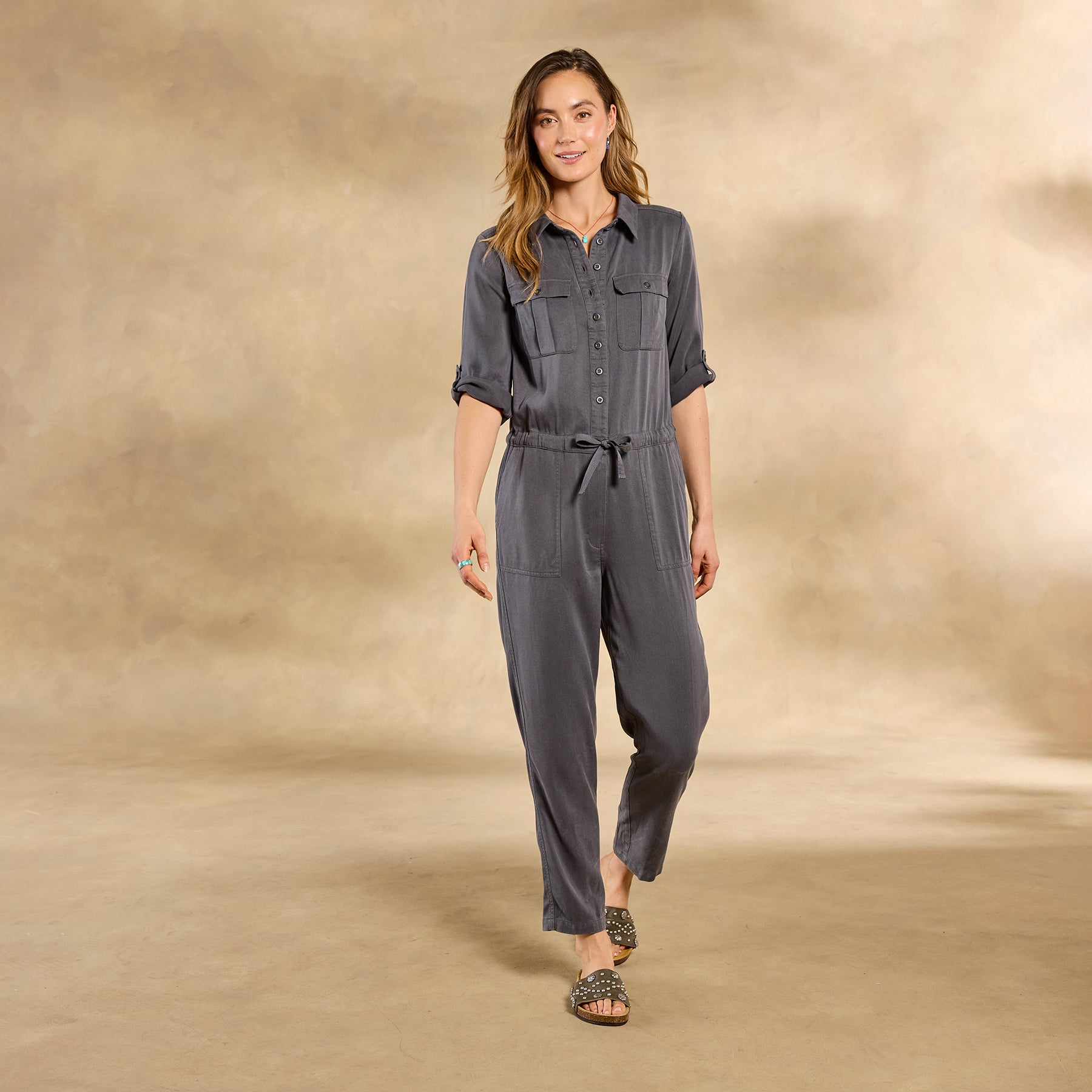 Our jumpsuit in petites has a relaxed. button-front silhouette with beautiful drape. six pockets. drawstring tie. roll-tab sleeves and distressed metal buttons. Lyocell/viscose. Machine wash. Imported. Exclusive. Sizes XXS (00). XS (0 to 2). S (4 to 6). M (8 to 10). L (12 to 14). XL (16 to 18). Approx. 56-1/2L. 26 inseam.