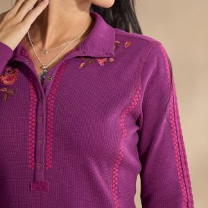 So flattering. our mock neck henley is blooming with stunning. multi colored floral embroidery. feminine lace insets at the sleeves and metal snaps at the placket. Princess seams. Cotton. Machine wash. Imported. Exclusive. Sizes XS (0–2). S (4–6). M (8–10). L (12–14). XL (16–18). XXL (20–22). Approx. 25l.