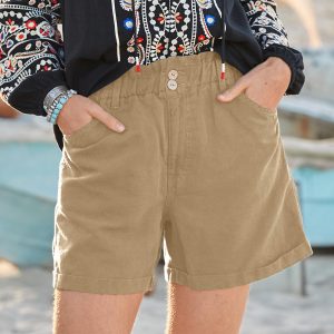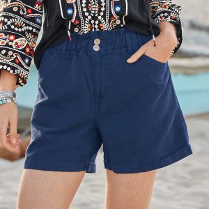 The most utilitarian shorts in your suitcase now updated for extra style. Paper-bag elastic waist. coconut buttons. zipper fly and rolled cuff hem. Cotton/linen. Machine wash. Imported. Exclusive. Sizes 0–14. 4.5 inseam
