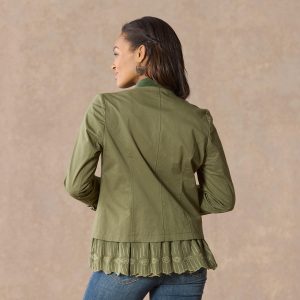 Contrasting velvet trim at the collar and welt pockets lends beauty to our fully lined jacket with ruffle and embroidery detail at the hem and sleeves. Filigree buttons. Cotton/spandex. Machine wash. Imported. Exclusive. Sizes XXS (00). XS (0??). S (4??). M (8??0). L (12??4). XL (16??8). Approx. 20.5l.