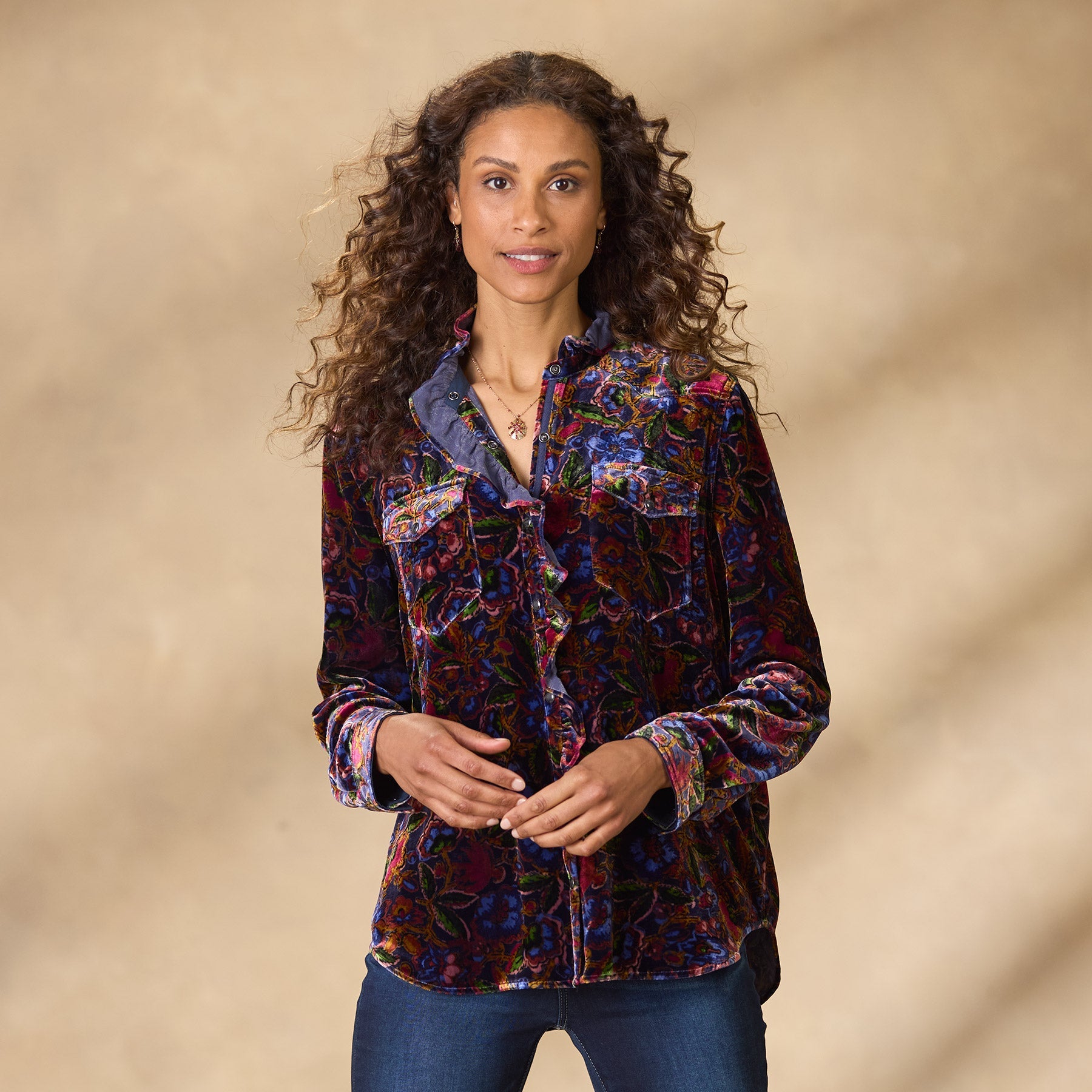 A Sundance favorite now in printed velvet florals. this Western inspired. soft plaid shirt is beautiful with ruffles at the neckline for a feminine twist. Two patch pockets. snap closure and bandana print detail inside. Viscose/silk. Dry clean. Imported. Exclusive. Sizes XS (0–2). S (4–6). M (8–10). L (12–14). XL (16–18). XXL (20–22). Approx. 26l.