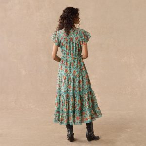 Feminine and flowing. a palette of gorgeous florals with contrast border print details. pintucking. elastic waist. double flutter sleeves and tiered hem. Fully lined. Cotton/silk. Hand wash. Imported. Exclusive. Sizes XXS (00). XS (0??). S (4??). M (8??0). L (12??4). XL (16??8). Approx. 49.5l.