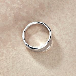 Our sterling silver ring impresses with its purposely imperfect contours. Handcrafted with a shiny finish. Exclusive. Whole sizes 5?C9. 3/8 tapers to 1/8w.
