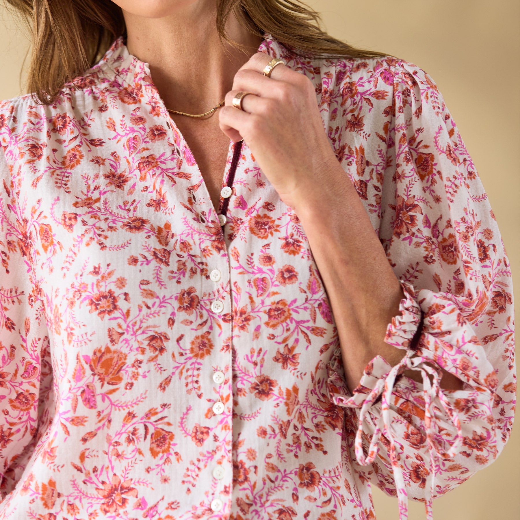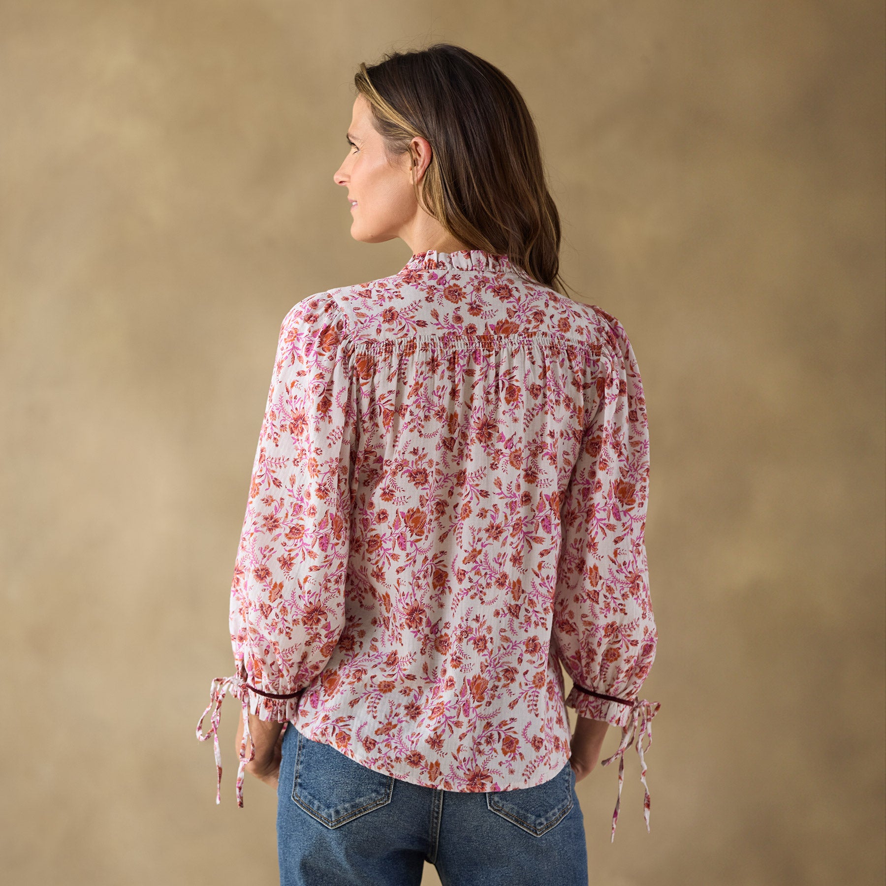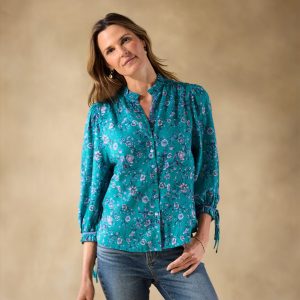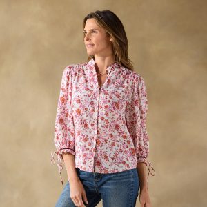 So easy—our feminine top is as beautiful as it is relaxed with button-down front. ruffle details at the neckline and bracelet length cuffs. contrast velvet trim and two lovely rows of smocking. Adjustable ties at the cuffs. Cotton. Machine wash. Imported. Exclusive. Sizes XS (0??). S (4??). M (8??0). L (12??4). XL (16??8). XXL (20??2). Approx. 25l.